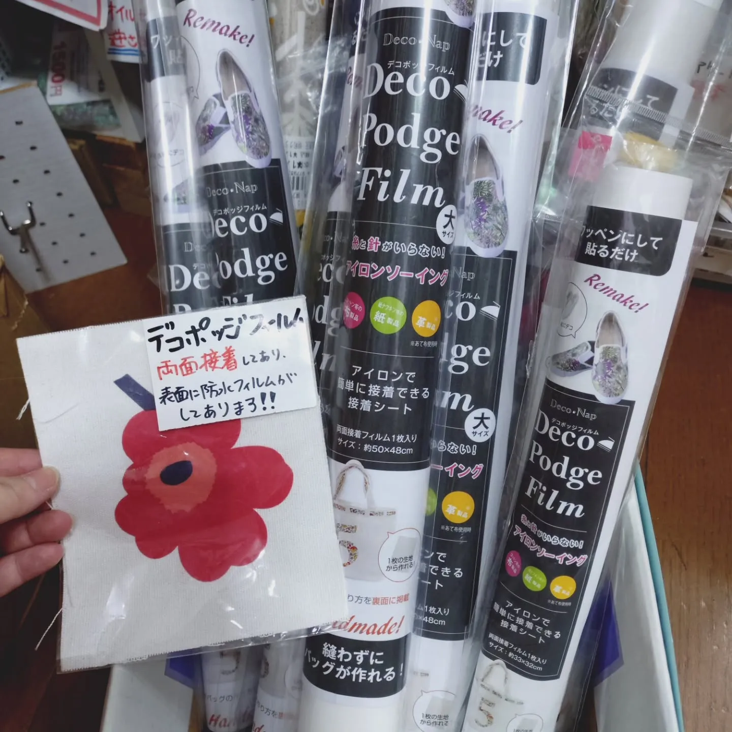 デコポッジフィルムで両面接着芯で簡単アイロンソーイングができ... デコポッジフィルムで両面接着芯で簡単アイロンソーイングができます!ワッペンやトートバックなどいろいろ作ることができますよ!ラミネートも資材フェスタにえ販売致します!#abc500en#資材フェスタ#ハ…